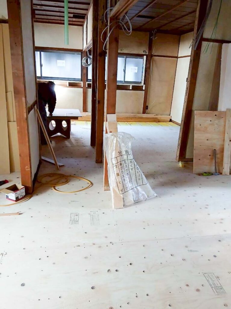壁や天井、床をすべて撤去し、建物の中はスケルトン状態になりました。フルリノベーションでは、この解体工程で建物の状態をしっかり確認することがとても大切になります。