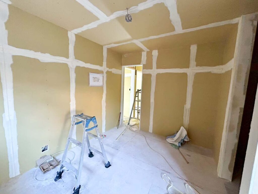 前回の断熱工事・下地工事を経て、壁や天井に石膏ボードを貼る工程が進み、現在はほぼ完了となりました。